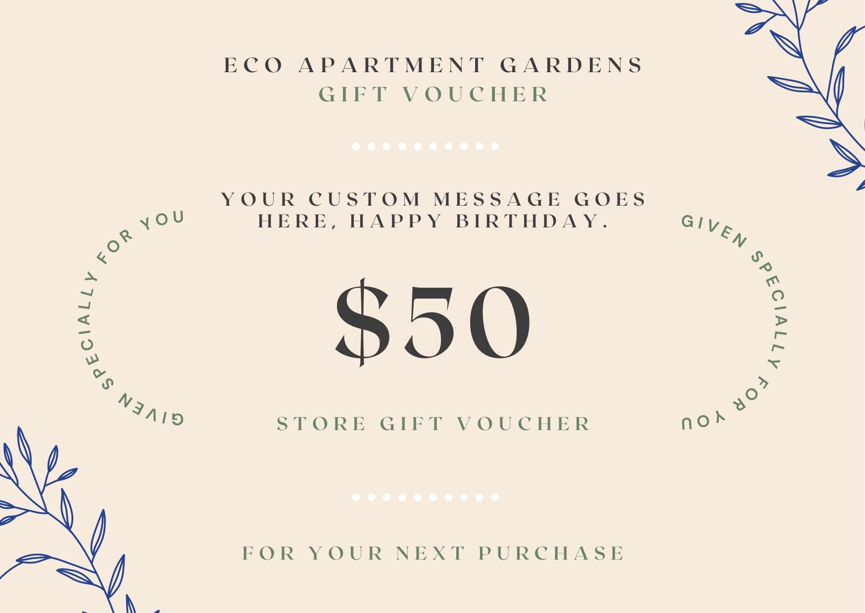 To inquire about larger voucher amounts please email adam@ecoapartmentgardens.com